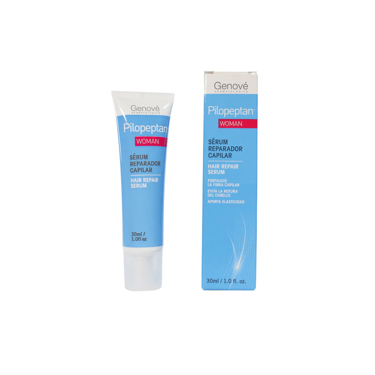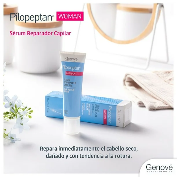 ¡Repara y revitaliza tu cabello con Pilopeptan Woman Suero Reparador Capilar 30 ml! Ideal para mujeres con cabello seco, dañado o con tendencia a la rotura, este sérum vegano con vitamina E, queratina y activos emolientes nutre, fortalece la fibra capilar y evita la caída por rotura (+35% resistencia*). Hidrata, reduce el frizz, protege del calor y aporta una textura sedosa y brillante, incluso en días húmedos. Hipoalergénico, sin parabenos ni alcohol, aplica 1-2 gotas en medios y puntas, seco o húmedo, sin enjuagar. ¡Perfecto para un cabello fuerte y radiante!