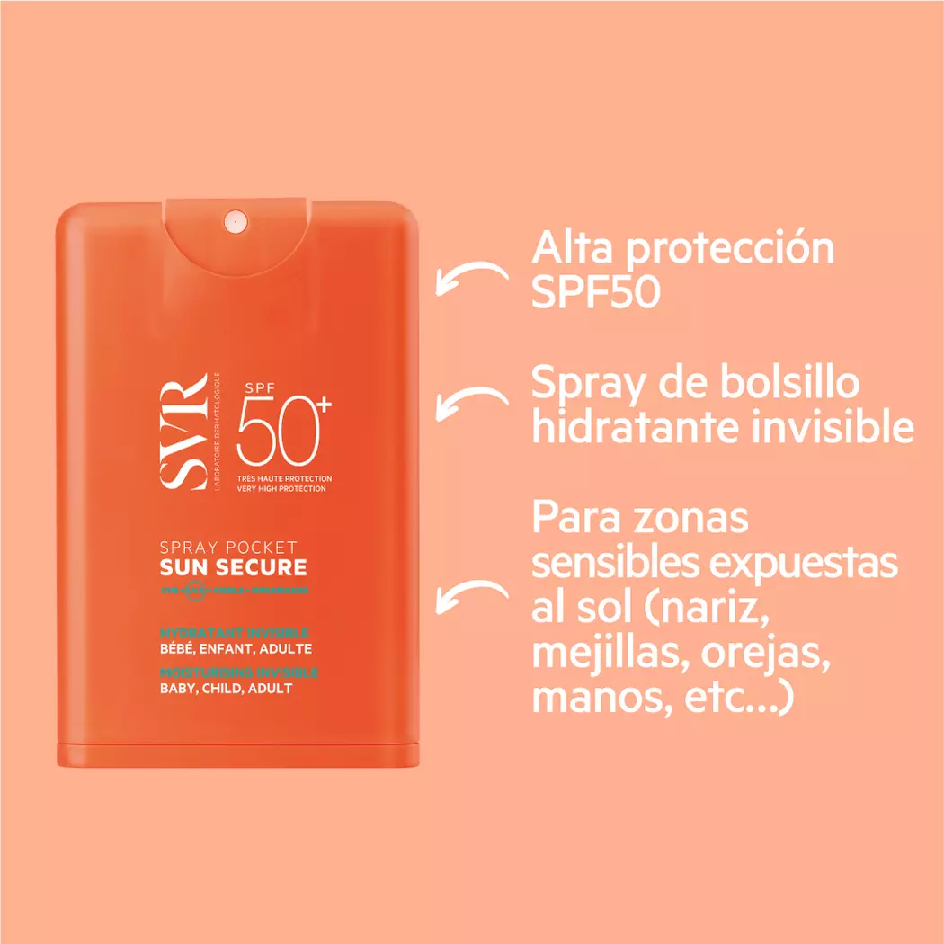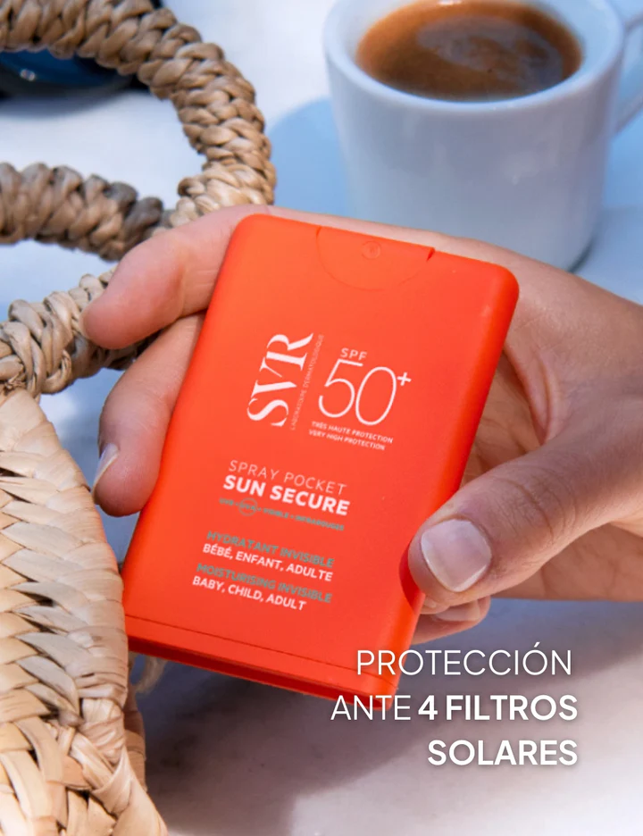 ¡Protege tu piel en cualquier momento con SVR Sun Secure Spray Pocket SPF 50+ 20 ml! Este protector solar en spray de bolsillo, ideal para pieles sensibles de bebés (desde el nacimiento, excepto prematuros), niños y adultos, ofrece alta protección contra rayos UVA/UVB, luz visible e infrarrojos. Su fórmula con niacinamida y cuatro filtros orgánicos fotoestables hidrata, se absorbe rápido y deja un acabado no graso ni pegajoso con una fragancia veraniega (+95% satisfacción*). Hipoalergénico, resistente al agua, sudor y roces, aplica generosamente en rostro y zonas expuestas (nariz, orejas, manos) antes de la exposición solar, reaplicando cada 2-3 horas. ¡Perfecto para una piel protegida y radiante en cualquier lugar!