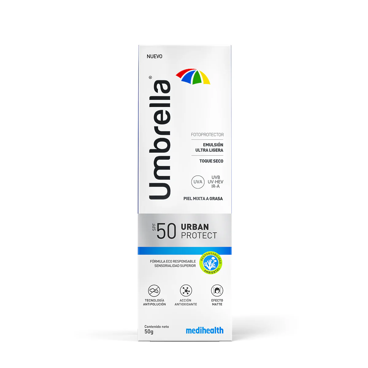 ¡Protege tu piel con Umbrella Urban Protect SPF 50+ Emulsión 50 g! Ideal para pieles mixtas a grasas o con tendencia acneica, este protector solar de última generación ofrece protección de amplio espectro contra rayos UVA/UVB, luz visible (UV-HEV) e infrarrojos (IR-A). Su fórmula ultraligera, con acción antipolución y antioxidante, combate el daño ambiental, reduce la inflamación crónica y previene manchas y arrugas. Hipoalergénico, no comedogénico, sin fragancias ni parabenos, se absorbe rápido con un acabado mate. Aplica en rostro, cuello y escote limpios 20 minutos antes de la exposición solar, reaplicando cada 3-4 horas. ¡Perfecto para una piel protegida y radiante en la ciudad!